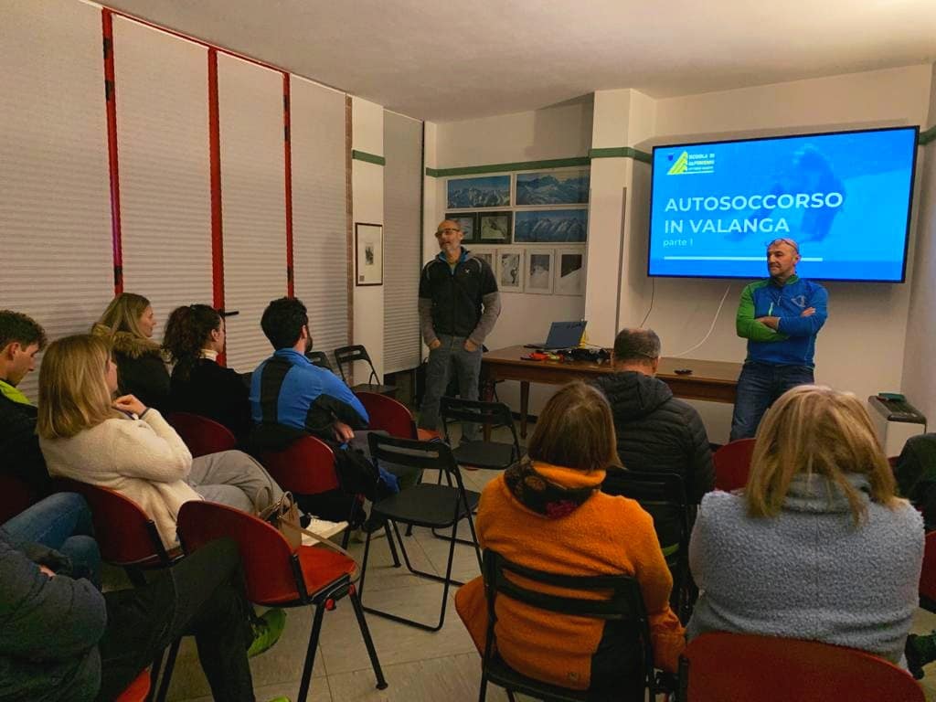 Un corso monotematico (quindi più breve dei classici corsi CAI) istituito a seguito delle nuove normative sull’obbligo di dotazione del kit di autosoccorso in valanga, del 2022.